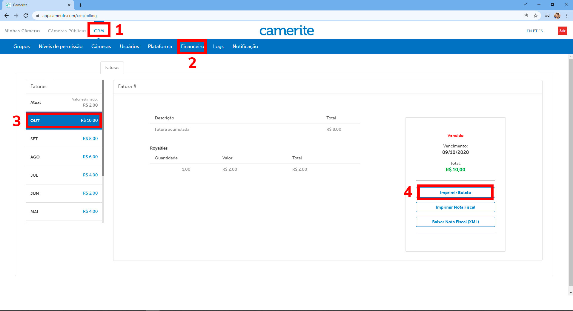 Após o fechamento, o boleto estará disponível na guia ”financeiro” em CRM na plataforma Camerite.