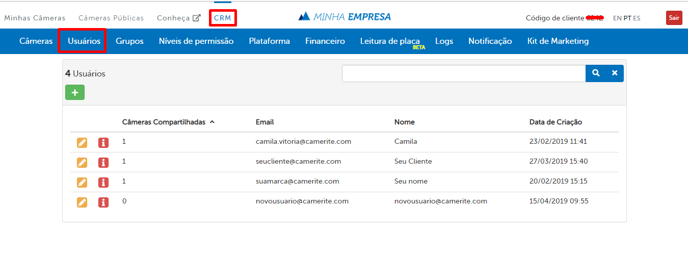 Estando logado na sua plataforma, acesse o menu “CRM” e em seguida “Usuários”: